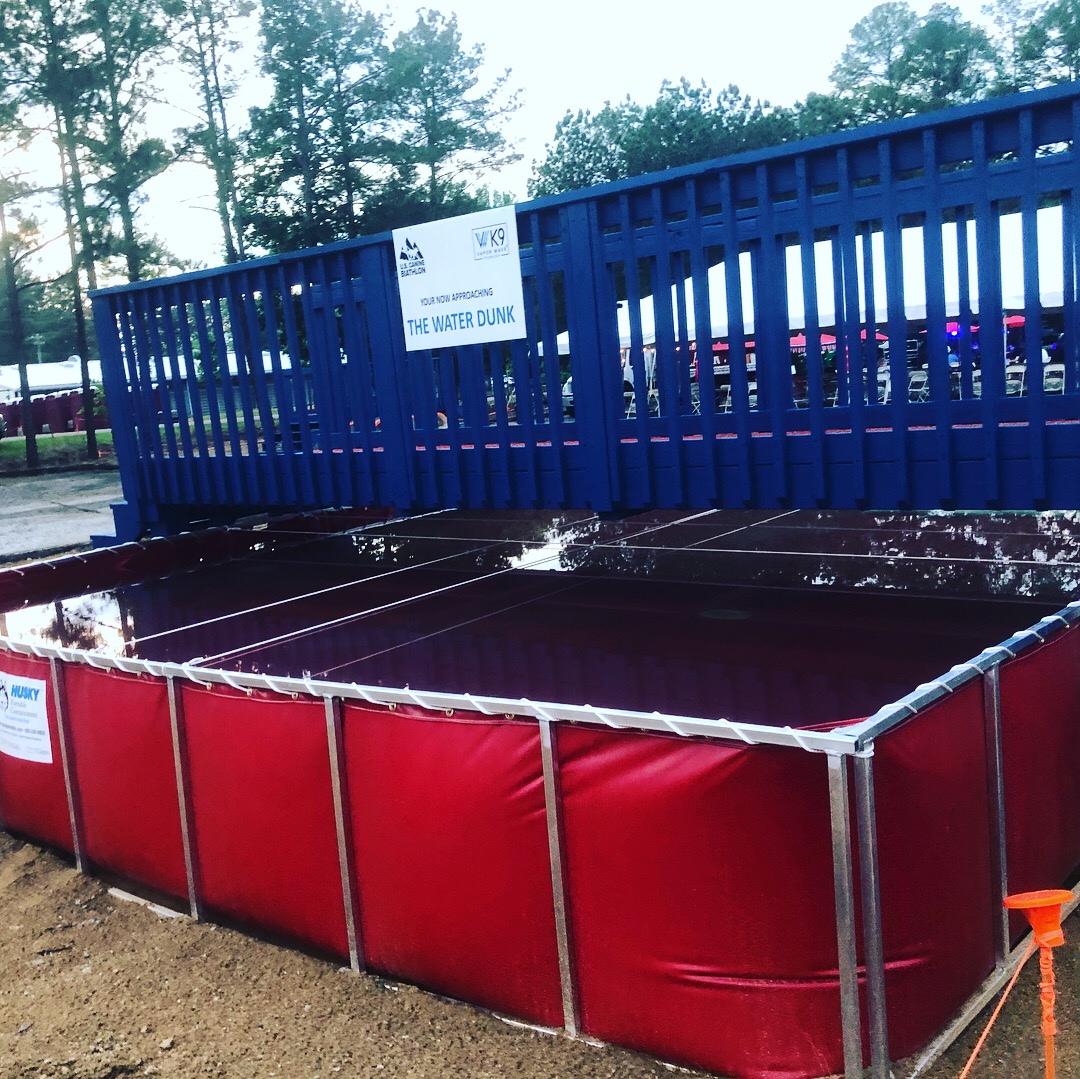The course was a tough 4.1 miles and winds through the woods where there is plenty of shade and water. It includes about 50 different obstacles that included sand hills, steps and platforms, pools of water (humans have to go under while dogs are able to swim above), A-frames to climb up and over, rocky creek beds with flowing water (Spider Mile), drainage pipes to crawl through, mud crawls, cars to go up and over (how many cars can be left in the middle of the woods???!!!), giant wooden spools to climb up and over, Snake Mountain which is an up and down hard dirt tortuous route with ropes for the humans to climb up and down (I left part of my left buttocks on one of the hills), a wall of tires to climb up and down through, Heartbreak Hill, the dunking pool, and a dog carry across a log (that was the one and only obstacle we couldn’t complete).