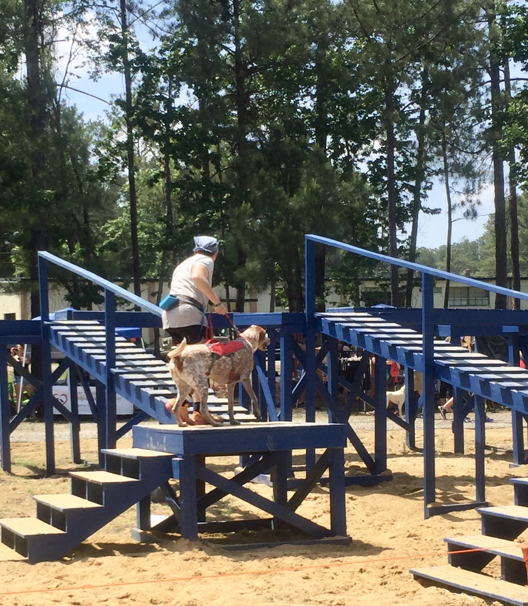 When it was time for us to go, Bugg wasn’t quite sure what to do. The course starts by going up and over several small sand dunes. Bugg’s first reaction was to head off the course to the road but I prompted him to stay by my side. Next came steps and a platform that included a wobbly bridge to cross. Bugg was a bit shaky and I could see he was considering jumping off the side which would have taken me with him since he was attached around my waist. After several seconds passed, we made it across. Two short obstacles and already others were passing by us. I thought to myself, this was going to be a long day of going slow and providing lots of positive reinforcement. We’d take as much time as Bugg needed. A pool of water came next that had wires across the top just inches above the waterline. Dogs could swim across and stay above water but humans had to go under to make it across. Once I entered the pool and was able to lift Bugg in, he completed it fabulously.